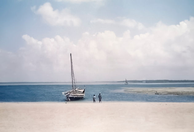 La nit és tranquil·la . Avançant dins la foscor per sobre d’un mar encalmat, només sentim la remor de l’aigua contra el casc. És negra nit i només endevinem a la llunyania les llums de Lamu. No veiem els nostres companys de navegació fins que de sobte un gran núvol es mou i com si s’obrís el teló deixa que aparegui per art de màgia una lluna plena gegant que ho il·lumina tot. Davant meu, quatre dones enfundades en els seus “bui-buis”. Negres de cap a peus, riuen ensenyant les seves dents blanquíssimes mentre els vels voleien contra la llum de la lluna i juguen amb l’aire emmarcant les seves cares completament rodones i fosques, donant a l’escena un aire d’irrealitat i misteri.